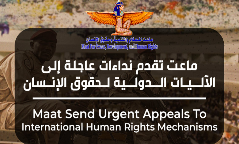 في إطار متابعة مؤسسة ماعت للسلام والتنمية وحقوق الإنسان للأوضاع الإنسانية في السودان الذي مزقته الحرب، وبصفتها الاستشارية لدى المجلس الاقتصادي والاجتماعي للأمم المتحدة، قدمت ماعت عدد من النداءات العاجلة للآليات الدولية لحماية حقوق الإنسان، لحثها على التدخل الفوري لوضع حد للانتهاكات المتكررة التي تشهدها الدولة السودانية من قبل الجيش السوداني وقوات الدعم السريع، والعمل على تشجيع بدء هدنة إنسانية دائمة، والعودة إلى المفاوضات من أجل استعادة السلام في البلاد.